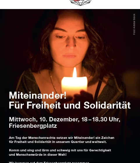 Am Tag der Menschenrechte setzen wir Miteinander ein Zeichen für Freiheit und Solidarität in unserem Quartier und weltweit. Komm und sing und lärm und schweig mit uns für Gerechtigkeit und Menschenwürde in dieser Welt! Wir kommen auf dem Friesenbergplatz zusammen für die Menschen, die nicht gesehen oder gehört werden und entzünden am Abend eine Kerze auf dem Platz und im Fenster unserer Wohnungen.