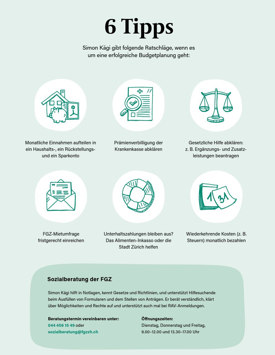 Nicht nur die FGZ bietet Hand. In der Stadt können Hilfesuchende auf ein grosses Angebot zählen. Dazu gehören Sozialhilfe, Zusatzleistungen zu AHV/IV, Stipendien oder AlimentenBevorschussung. Viele Menschen haben ein Anrecht auf Unterstützung, nur wissen sie es nicht oder schämen sich, finanzielle Hilfe anzunehmen. Wussten Sie zum Beispiel, dass die Krankenkassenprämie in speziellen Monatliche Einnahmen aufteilen in ein Haushalts-, ein Rückstellungs- und ein Sparkonto FGZ-Mietumfrage fristgerecht einreichen Wiederkehrende Kosten (z. B. Steuern) monatlich bezahlen Prämienverbilligung der Krankenkasse abklären Unterhaltszahlungen bleiben aus? Das Alimenten-Inkasso oder die Stadt Zürich helfen Gesetzliche Hilfe abklären: z. B. Ergänzungs- und Zusatzleistungen beantragen finanziell. Hier greift die Stiftung Hilfsfonds FGZ. Die Sozialberatung ist das Bindeglied, erklärt Simon Kägi. Oft kann er den Menschen helfen. Manchmal reicht es schon, wenn die Stiftung Hilfsfonds bei akuter finanzieller Not die Bezahlung einer Rechnung übernimmt oder wenn Simon Kägi bei frisch getrennten Paaren ohne Rücklagen bei der Berechnung des neuen Familienbudgets wichtige Hinweise gibt. Da ist zum Beispiel die Geschichte eines hoch verschuldeten Pensionärs, dem der Hilfsfonds mit einem zinslosen Darlehen bei der Schuldensanierung unter die Arme greifen konnte. Oder der Fall, als Simon Kägi im Sommer dieses Jahres einer verzweifelten FGZ-Bewohnerin einen Fällen von öœentlicher Stelle übernommen wird? Diese Form der Erleichterung ist gedacht für Menschen, die einen Anspruch auf Sozialhilfe haben, diesen aber nicht geltend machen wollen.